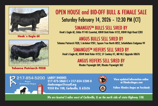 The highest priority for Rhodes Angus is producing seedstock with reproductive efficiency coupled with extended cow performance and productivity in a limited-resource fescue environment. Moderate birth weights and desirable calving ease combined with newborn calf vigor are very important to us as our customers rely on it. Foot and leg structure, udder quality, adequate milk, above-average growth, disposition, breeding vigor, stayability as well as carcass quality and yield round out the traits we most closely watch.